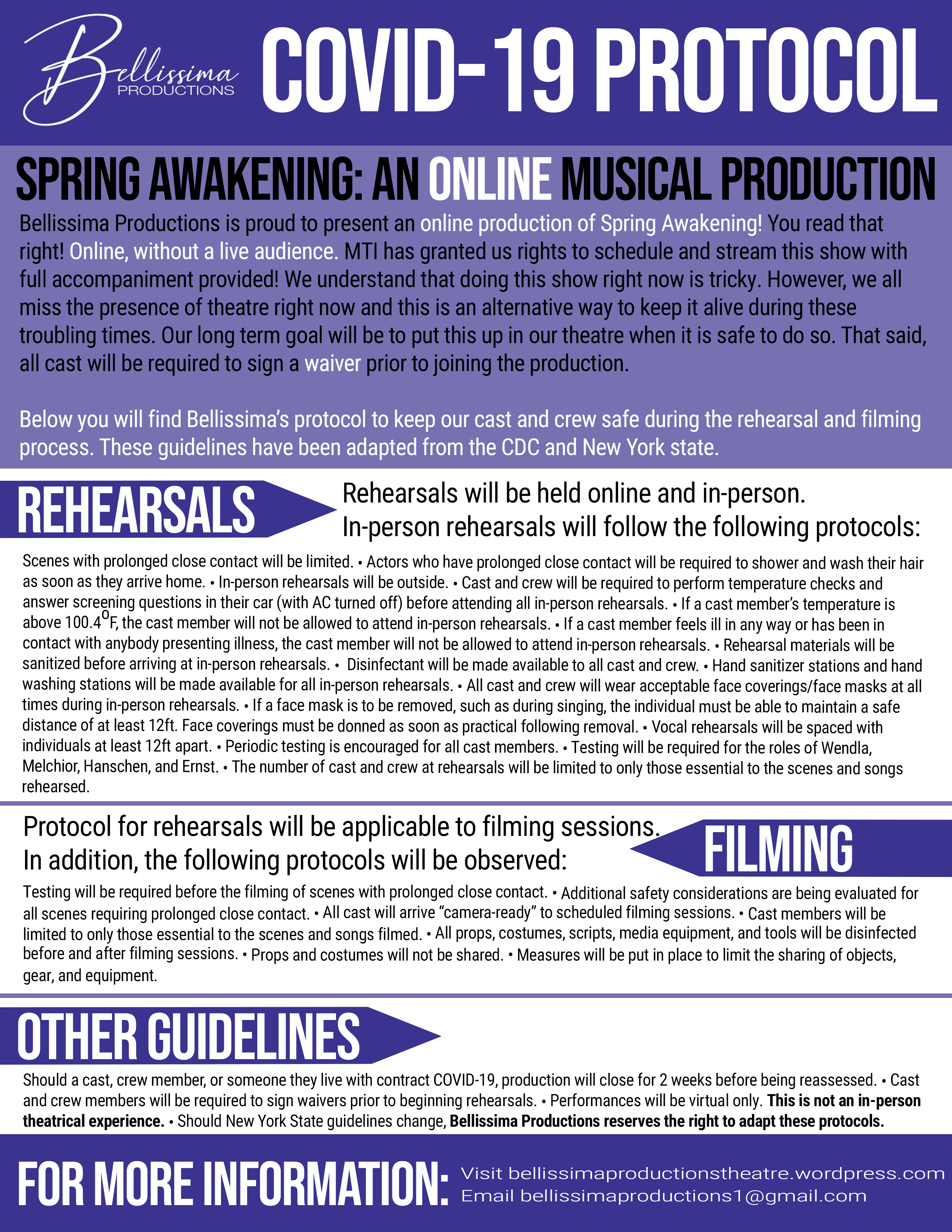 In October 2020, we premiered a filmed production of Duncan Sheik and Steven Sater’s Spring Awakening. Our cast and crew followed COVID-19 protocols, which exceeded guidelines from the CDC and New York State.
